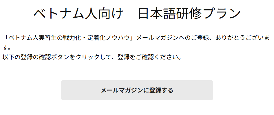 ご入力いただいたメールアドレス宛に、件名「ベトナム人実習生の戦力化・定着化ノウハウ・購読確認メール」というメッセージが届きます。